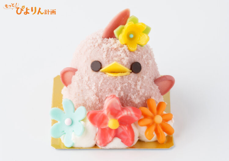 「花咲かタイムズ」の“花咲く情報”という番組コンセプトにインスパイアされ、ぴよりんも花を咲かせました。名古屋コーチンの卵を使った濃厚なプリンを、いちご味のババロアでつつみ、今回関連する3社のイメージカラー(青:ららぽーと、ピンク:番組、オレンジ:三井アウトレットパーク)の花のチョコレートを添えました。見た目も味も華やかに、心ときめくひとときをお届けします。